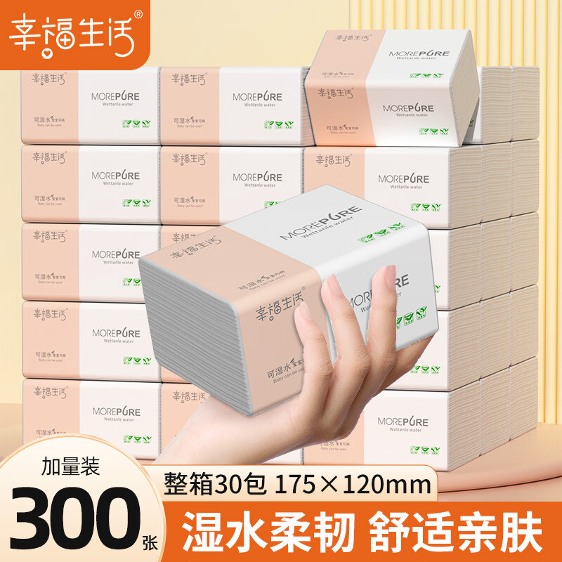 幸福生活抽纸卫生纸4层 300张*30大包整箱批发家用纸巾可湿水餐巾纸面巾纸