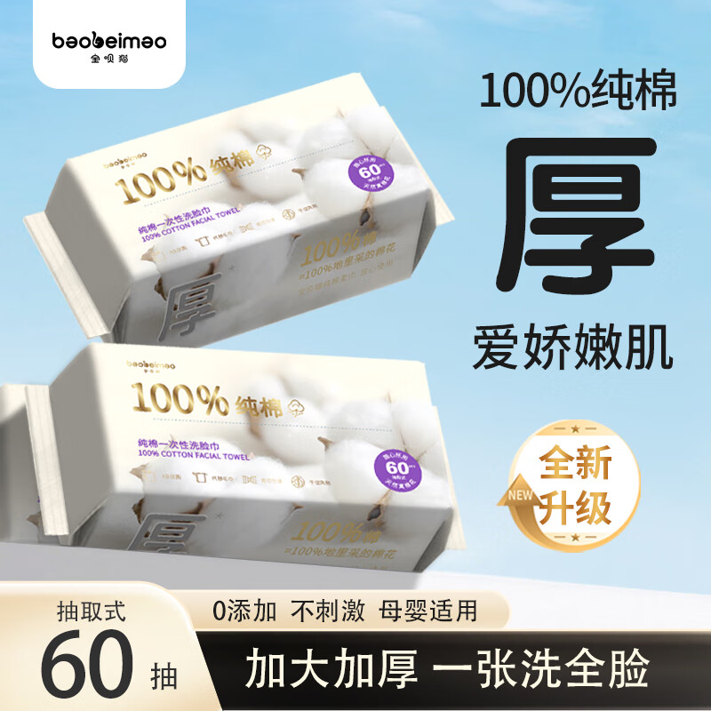 宝呗猫100%纯棉洗脸巾60抽*1包 一次性擦脸巾棉柔巾加大加厚母婴可用