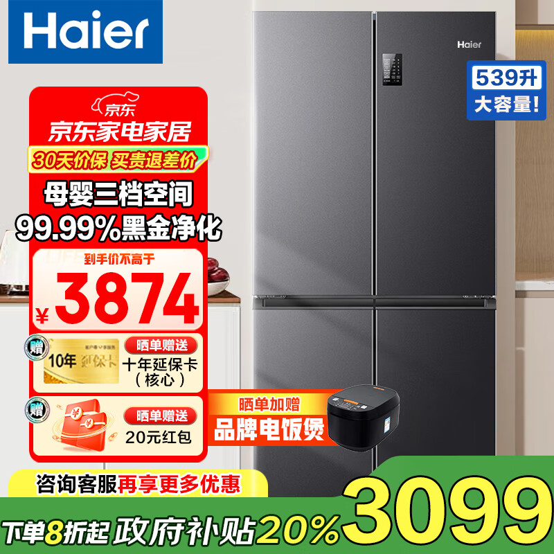 海尔冰箱539升十字对开门四开门双变频一级能效风冷无霜可嵌入式家用大容量双开门电冰箱政府补贴20% 三档变温+黑金净化