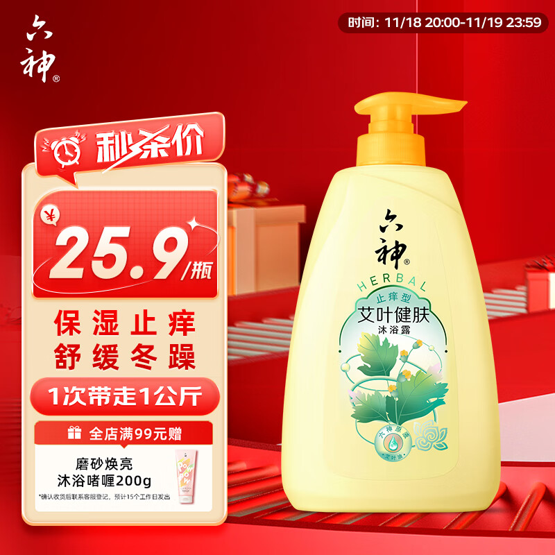 六神沐浴露艾叶止痒1kg 持久留香男士专用沐浴液乳女士保湿滋润家庭用