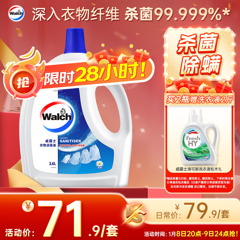 威露士衣物消毒液清新3.6L 杀菌99.9%除螨内衣衣物除菌液 可配洗衣液