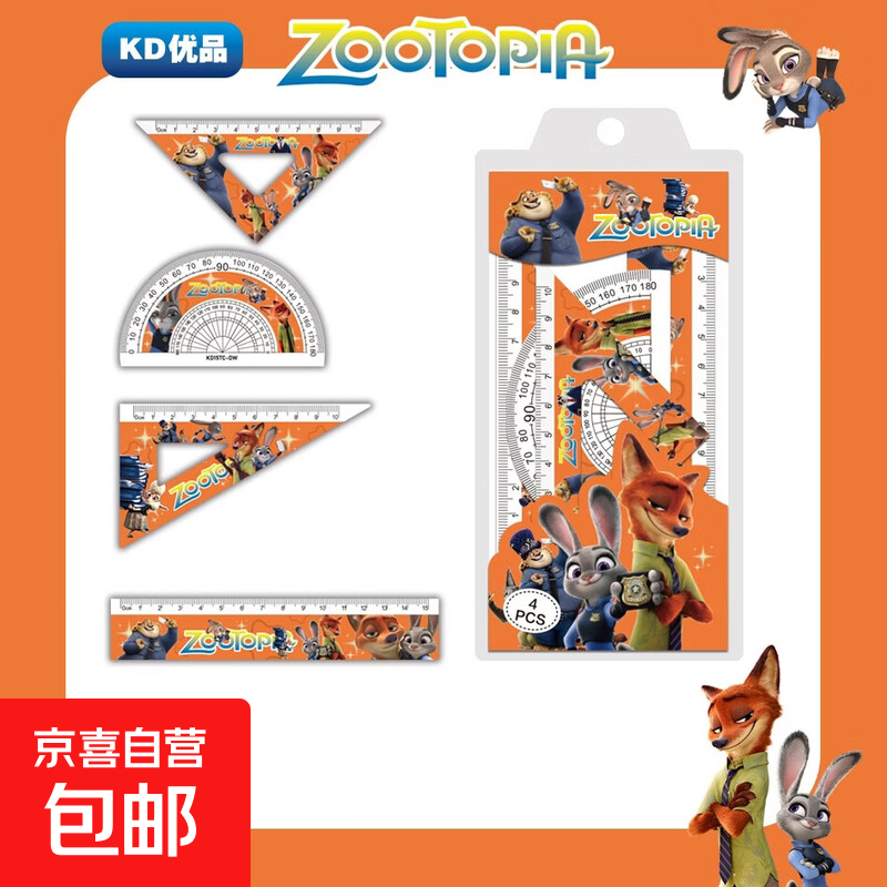 正版授权小学生初中量角器直尺三角尺套装绘图测量学习用品高颜值套尺ins 疯狂动物城IP硬套尺|四件套