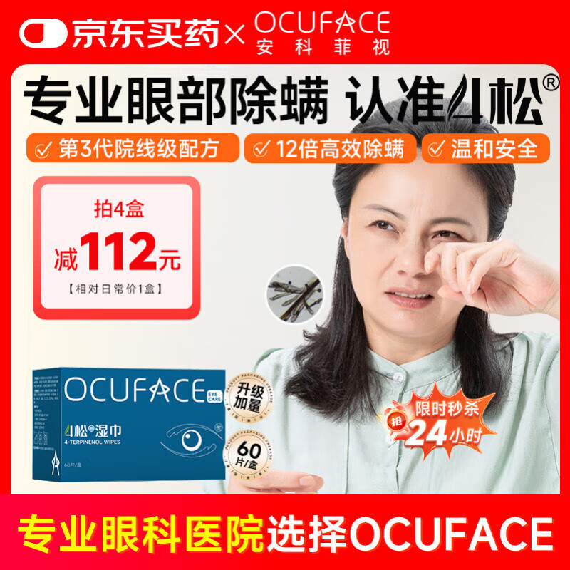 OCUFACE欧科4松湿巾四松油醇眼部除螨茶树油精华眼贴除螨虫棉片60片/盒