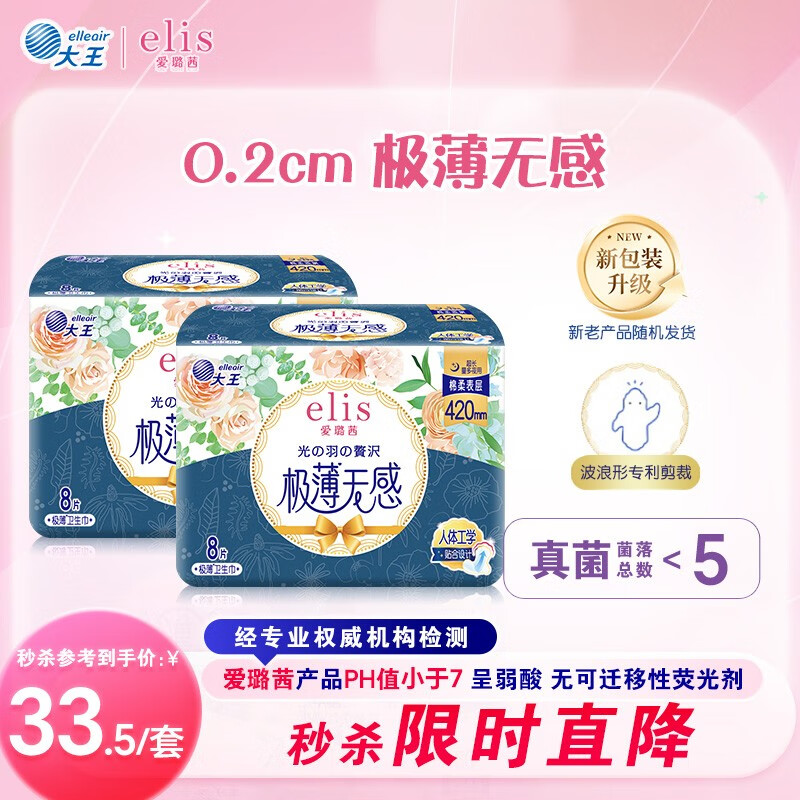 爱璐茜(elis)大王光羽奢适超长夜用卫生巾420mm*16片极薄棉柔姨妈巾加宽尾翼