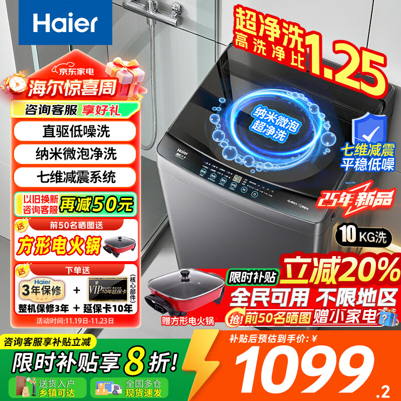 海尔(Haier)洗衣机全自动10公斤/12公斤直驱变频波轮家用洗衣机一级能效大容量AI智洗电离除菌 家电补贴20% 【新品10KG】直驱+超净洗净比1.25+七维减震