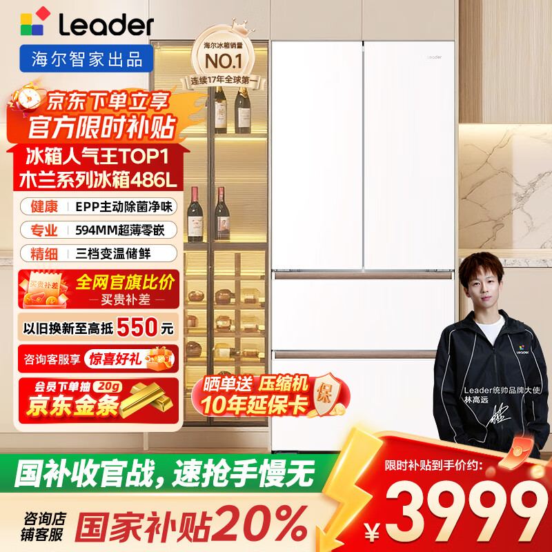 统帅(Leader)海尔智家出品木兰486L法式多门电冰箱大容量白色一级能效变频风冷LF4-510WL1U1国家补贴20%