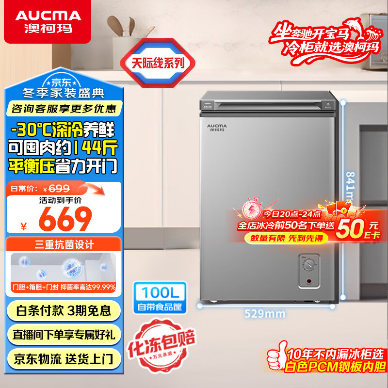 澳柯玛(AUCMA)100升低霜平嵌家用冰柜冷藏柜冷冻柜 无界单温冷柜 一级能效 天际线 BC/BD-100HSNE 国家补贴