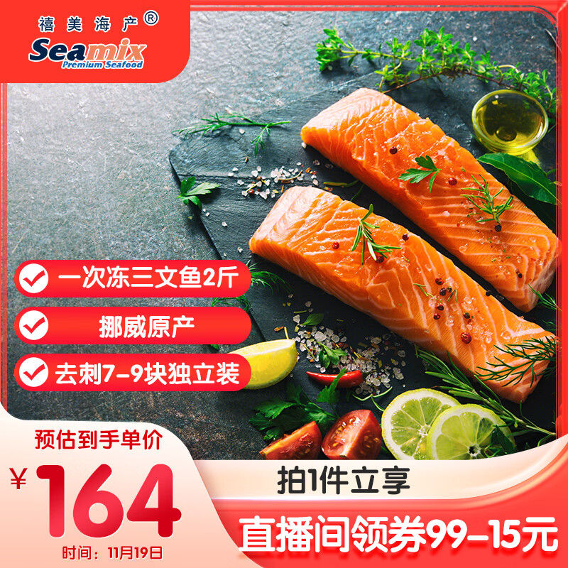 禧美海产 挪威原产一次冻大西洋三文鱼 净重2斤 去刺7-9块独立装 海鲜水产