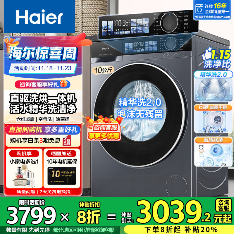 海尔(Haier)旗舰【云溪4.0】10公斤晶彩屏超薄直驱滚筒洗衣机全自动六位减震大容量BE37E精华洗2.0国家补贴 洗烘+直驱超薄+1.15洗净比+智投+蓝盾除菌