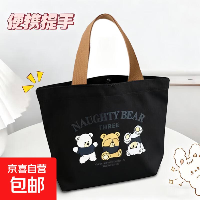 小熊帆布包女学生便携上班帆布兜手提包手拎便当帆布袋 三只小熊【黑色】