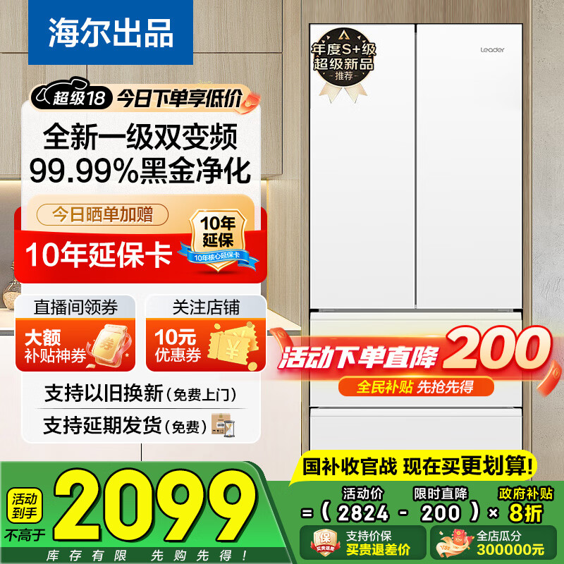 海尔(Haier)冰箱342升一级双变频风冷无霜双开门四门法式多门三档变温超薄可嵌入Leader系列家用家电国家补贴 342升冰雪白+1级双变频+黑金净味+冷藏三档变温