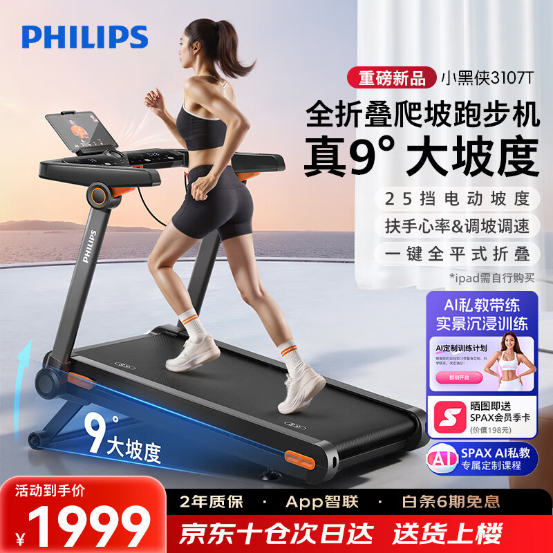 飞利浦智能跑步机全折叠家庭用静音室内健身房器材爬坡走步小黑侠3107T