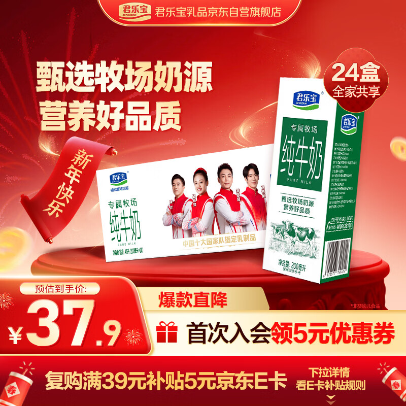 君乐宝【新鲜日期】专属牧场全脂纯牛奶 200mL*24盒量贩早餐年货好礼