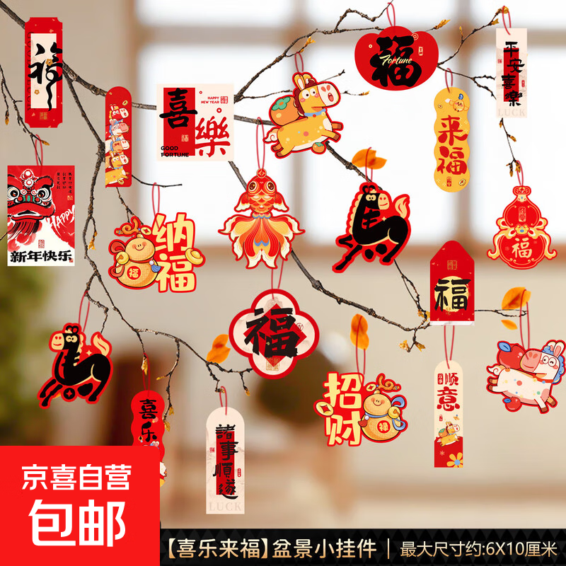 2026马年装饰新年春节过年家用盆景小挂件春节布置树上小灯笼挂饰 喜乐来福20个装
