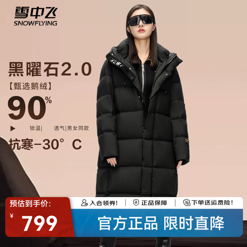 雪中飞【黑曜石2.0】秋冬新款男女同款情侣长款鹅绒羽绒服加厚抗寒 宝石黑|8086 165/88A