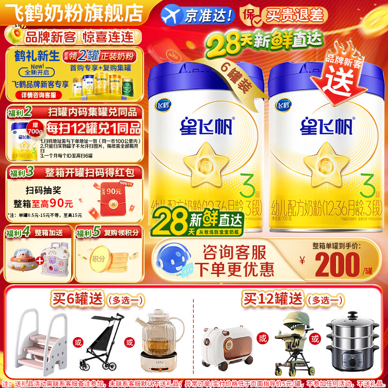 飞鹤星飞帆3段幼儿配方奶粉(12-36月龄)700克g专利OPO 育儿补贴 3段 700g 6罐 【热销爆款】