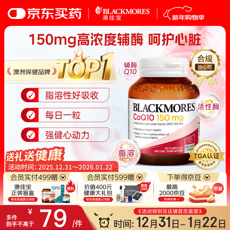 澳佳宝Blackmores辅酶q10高浓度150mg软胶囊高脂溶性好吸收30粒/瓶 送礼