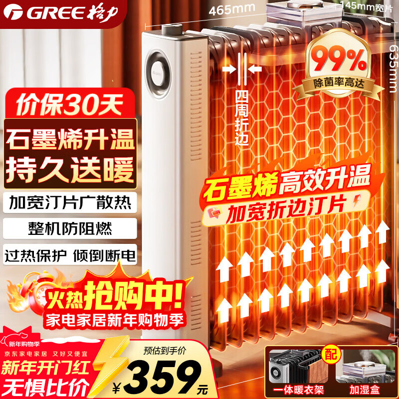 格力(GREE)石墨烯电油汀家用电暖器片13片油丁加宽防烫加热加湿干衣电暖气取暖电器NY23-S7022