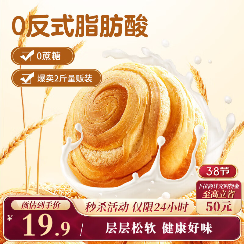 三只松鼠0蔗糖手撕面包 早餐小面包代餐饱腹整箱量贩休闲零食酵母1000g/箱