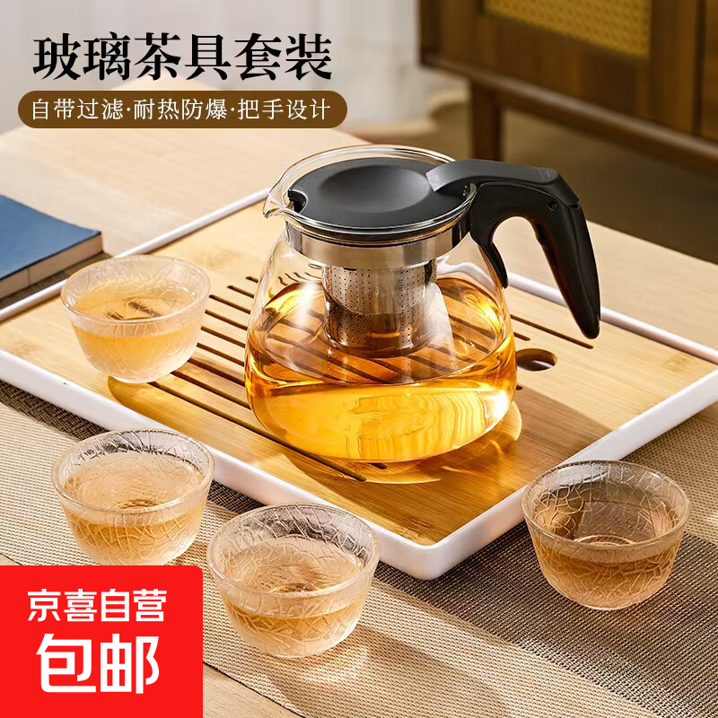 茶壶泡茶器整套茶具茶水分离玻璃耐热泡茶壶花茶套装茶漏 黑把一壶四杯 1000ml