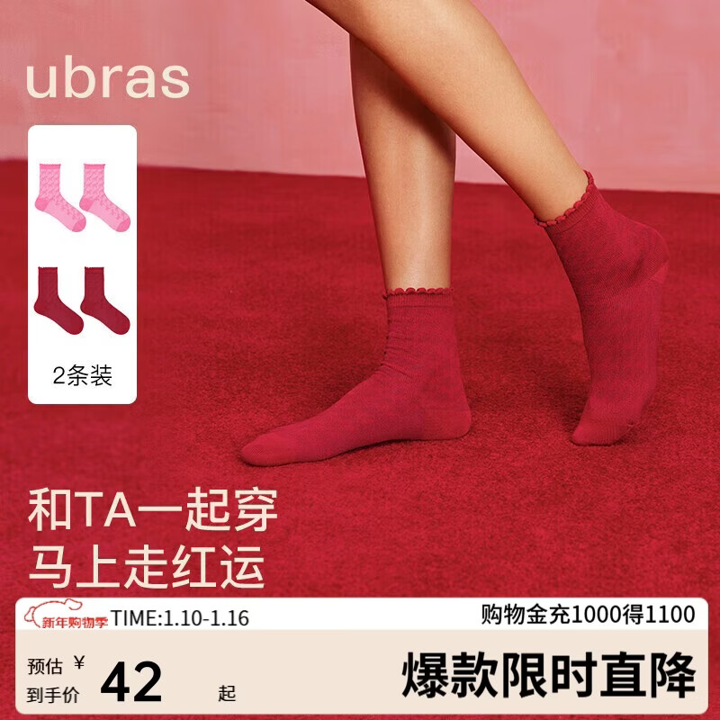 ubras25年新款红系列-新疆棉莱赛尔千马纹马上红女士中筒袜礼盒两双装