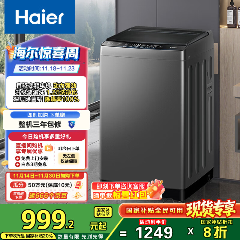 海尔(Haier)波轮洗衣机全自动 漩瀑洗1.25洗净比 直驱变频 清新换风 一级能效家用洗衣机敲敲洗XQB100-BZ20T0