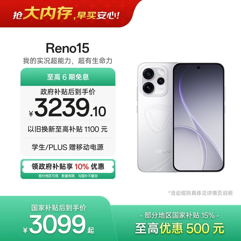 OPPO Reno15 16GB+512GB 星光蝴蝶结 2亿像素 实况拼图 5G智能小直屏学生游戏AI拍照手机 新品国家补贴