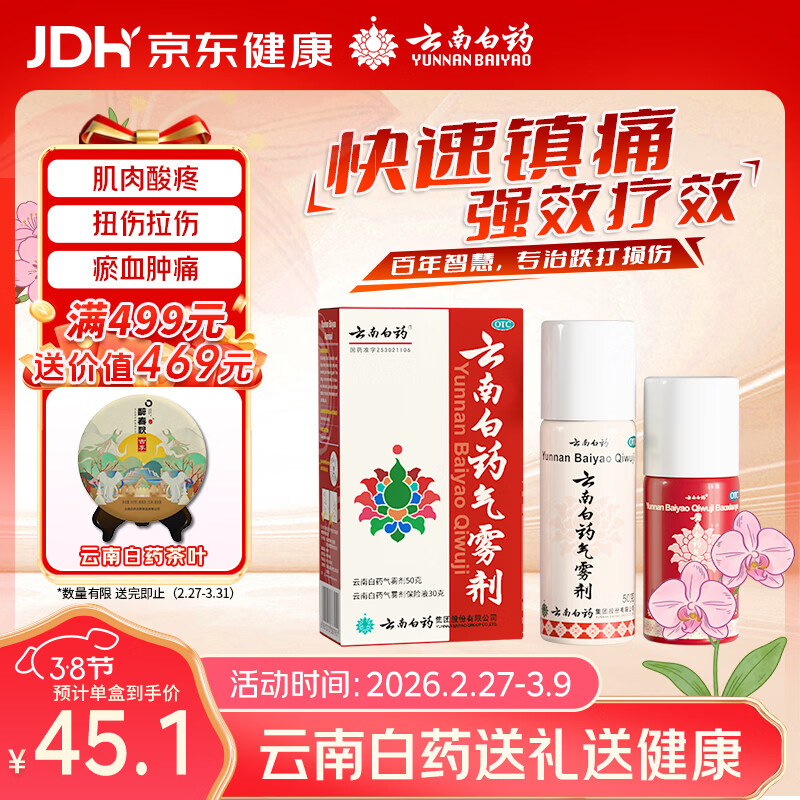 云南白药气雾剂50g+30g喷雾剂跌打损伤消肿止痛活血化瘀扭伤拉伤用于淤血肿痛肌肉酸痛风湿疼痛