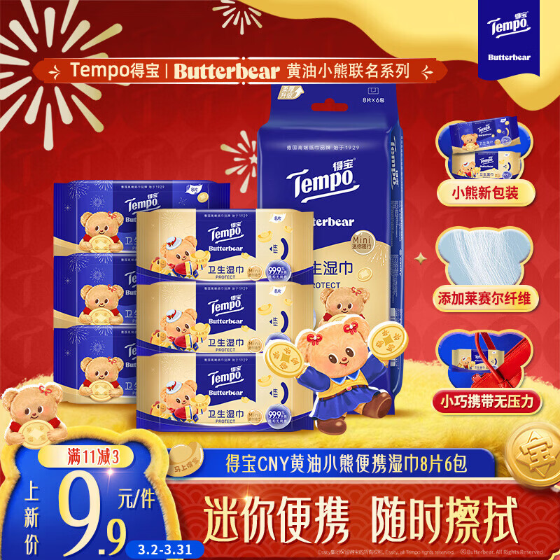 得宝(TEMPO)黄油小熊马年限定款 杀菌率99.9% 卫生湿巾8片*6包 湿纸巾 小包