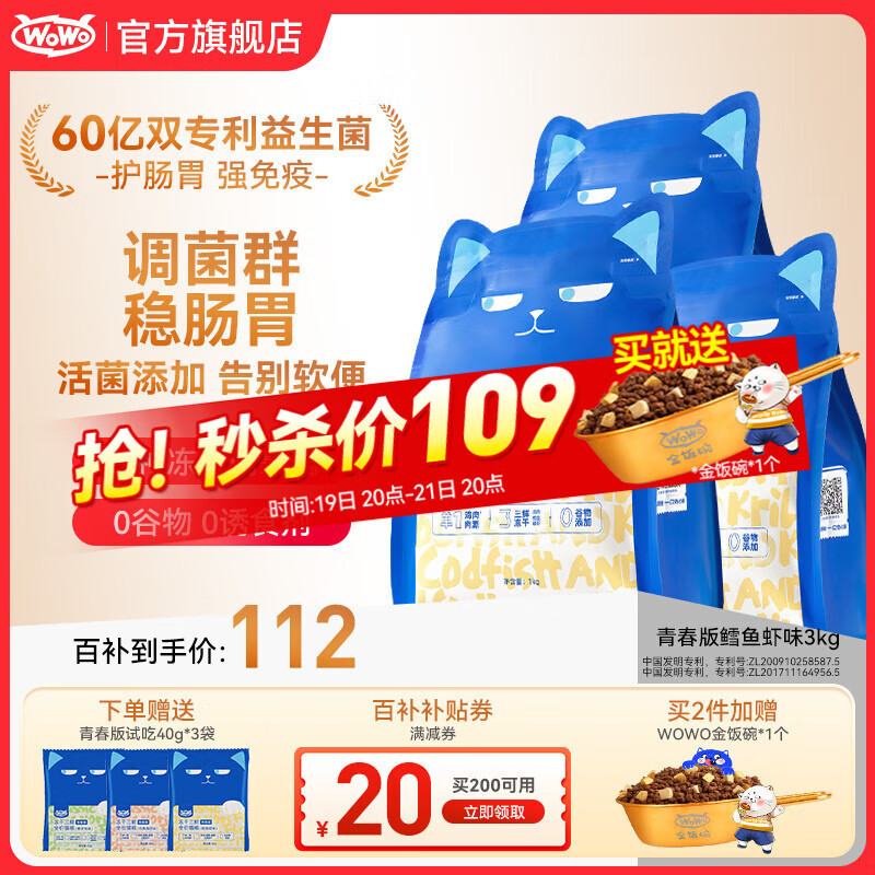 喔喔(WOWO)猫粮 冻干三鲜青春版成猫幼猫通用国产全价无谷猫干粮 鳕鱼虾味 鳕鱼虾3kg