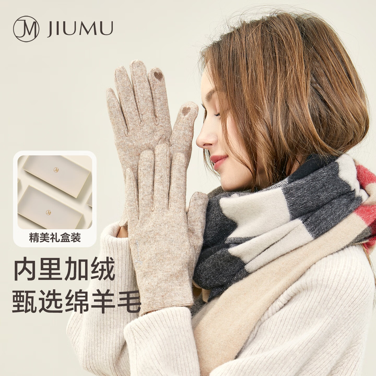 玖慕(JIUMU)绵羊毛保暖手套女冬季加厚加绒户外开车骑行防风防寒可触屏手套