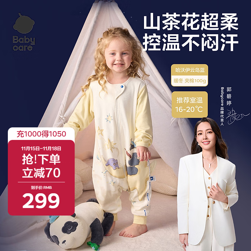 babycare新生婴儿秋冬山茶花桑蚕丝分腿睡袋防惊跳防踢被星岛黄90码暖冬