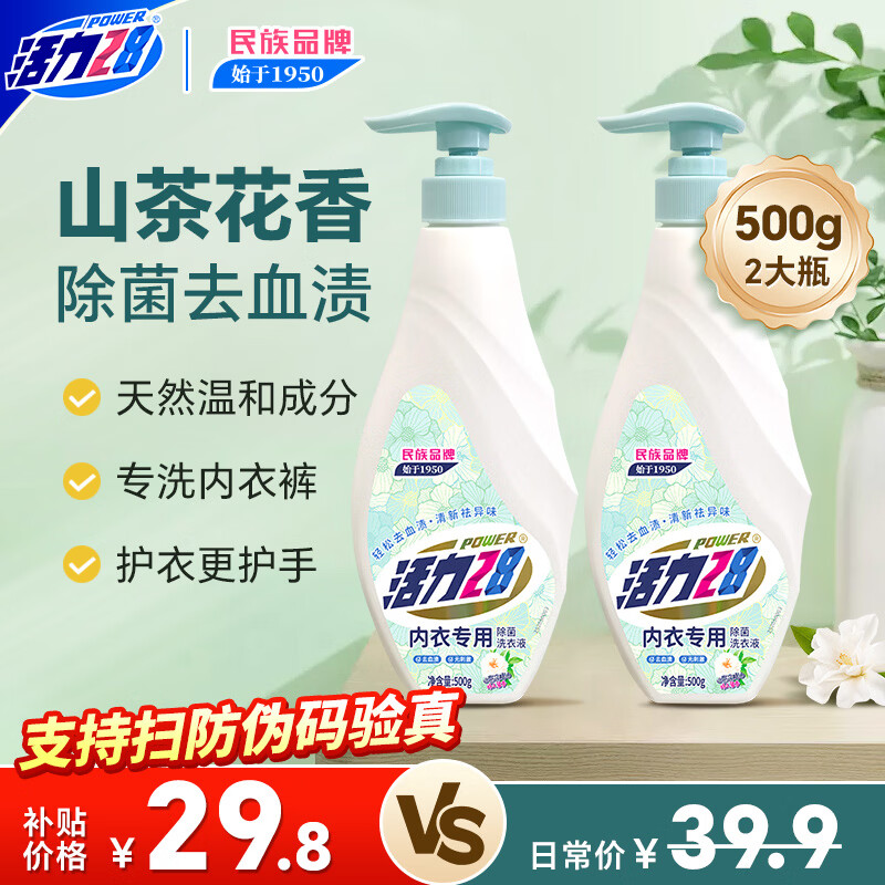 活力28山茶花内衣洗衣液500g*2瓶 山茶花香不添加荧光剂内裤内衣清洗液