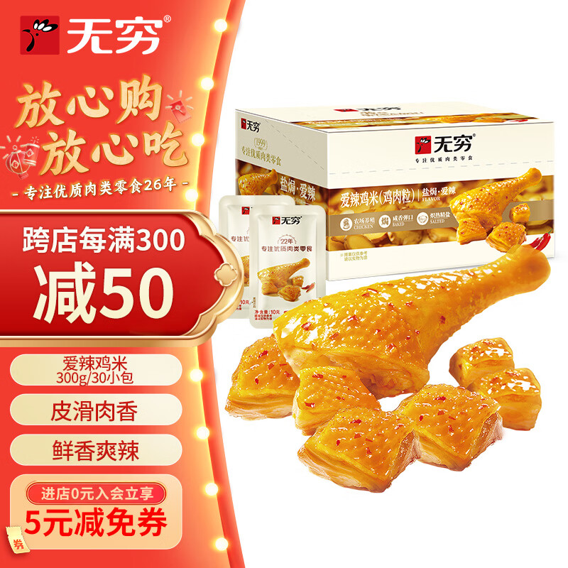 无穷 肉干肉脯即食香辣下酒小零食爱辣鸡米300g/盒共30小包