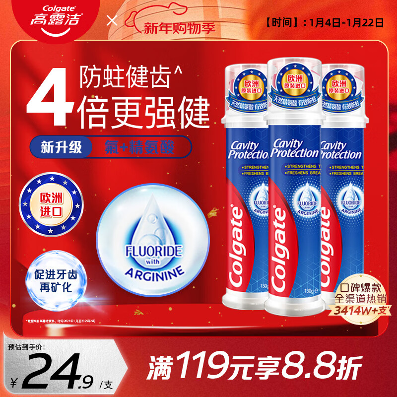 高露洁(Colgate)【孙颖莎同款】欧洲进口卓效防蛀直立按压泵式牙膏130g*3含氟健齿