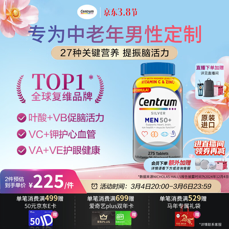 善存海外 中老年男士复合维生素 B族VCED3钙镁锌心血管脑活力 275粒