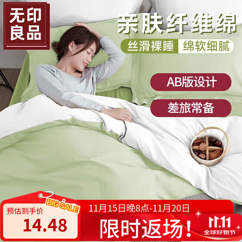无印良品四件套旅行一次性床单被套罩枕套加厚酒店床上用品双人款-白绿