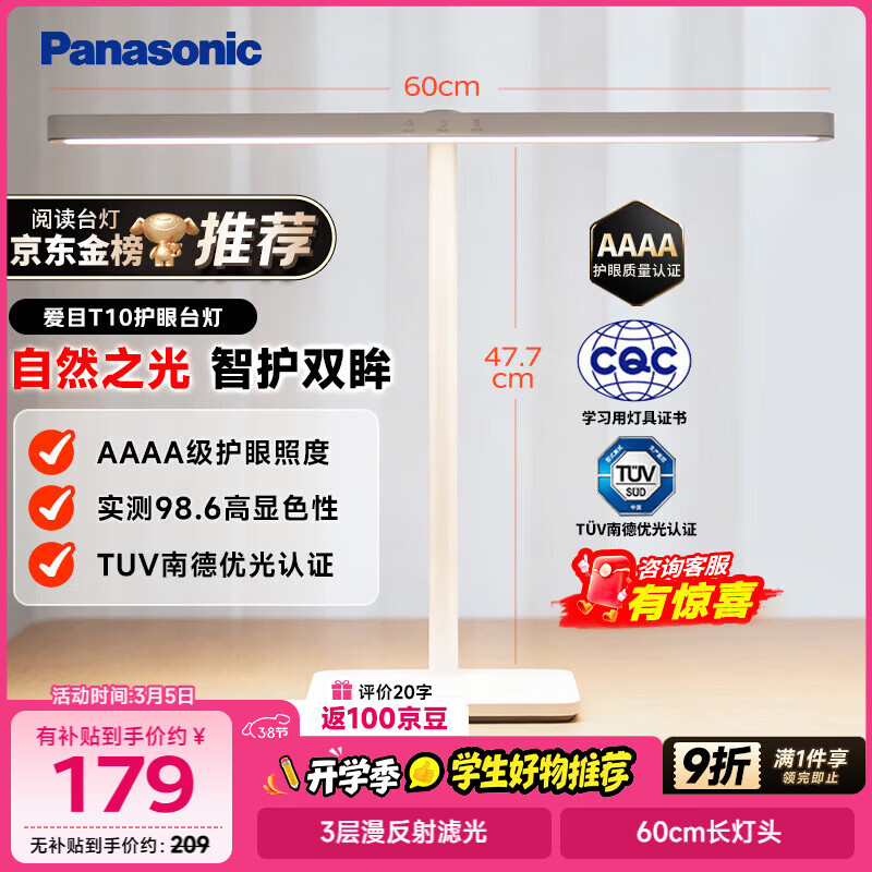 松下(Panasonic)阅读台灯(护眼灯)AAAA级护眼全光谱儿童学习横灯头 爱目T10