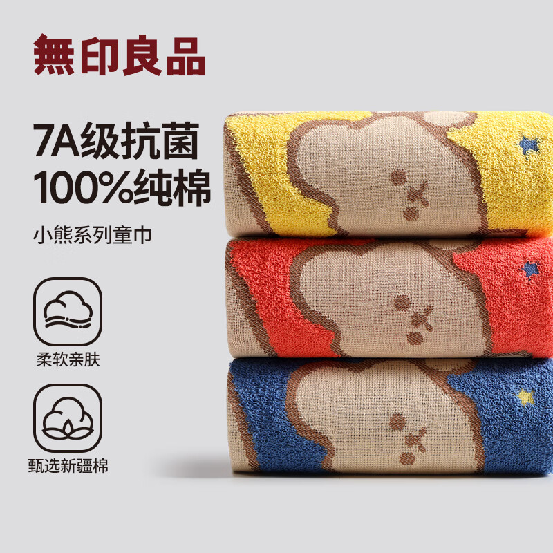 无印良品儿童毛巾3条装7A抗菌新疆棉100%纯棉毛巾童巾柔软亲肤口水巾