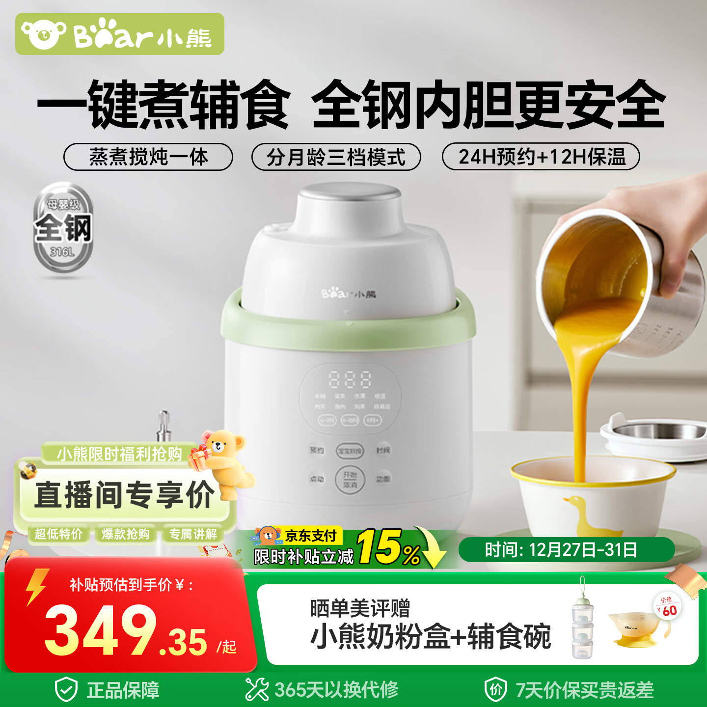 小熊(Bear)辅食料理机婴儿专用蒸煮搅炖一体多功能辅食锅煮米糊 6叶单杯单刀