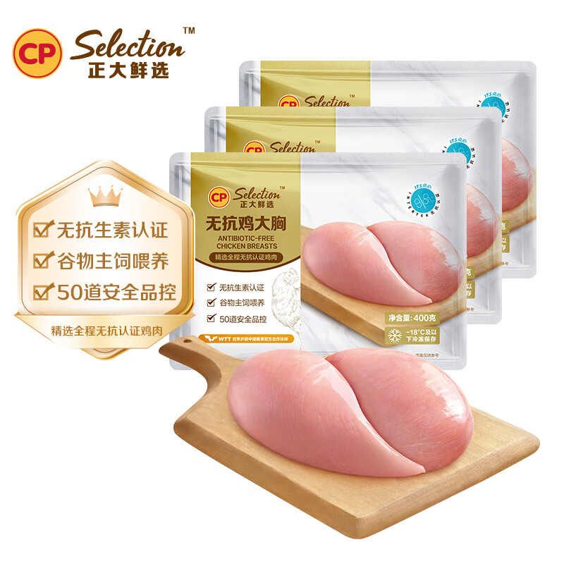 CP正大食品 无抗鸡胸肉2.4斤(共3包)鸡大胸无抗轻食鸡胸肉