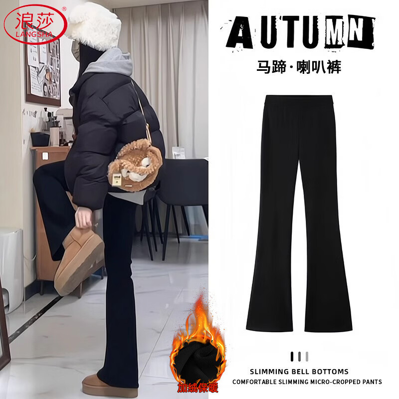 浪莎黑色微喇叭裤女冬季2025新款加绒加厚马蹄裤高腰显瘦休闲裤子