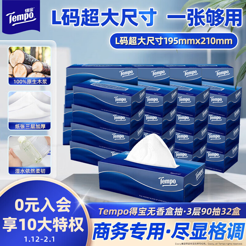 得宝(TEMPO)一博同款 抽纸 盒抽3层90抽*32盒高端商务 L码超大尺寸 纸巾