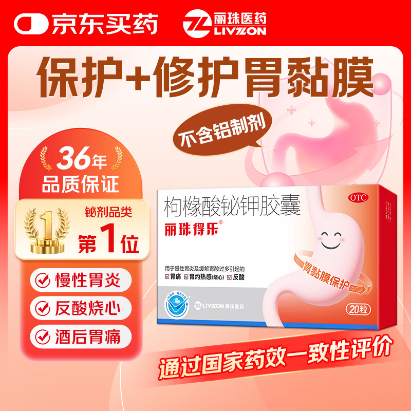 丽珠得乐 枸橼酸铋钾胶囊120mg*20粒/盒 胃痛 用于慢性胃炎 胃溃疡养护 胃灼热感 烧心反酸 胃黏膜保护剂