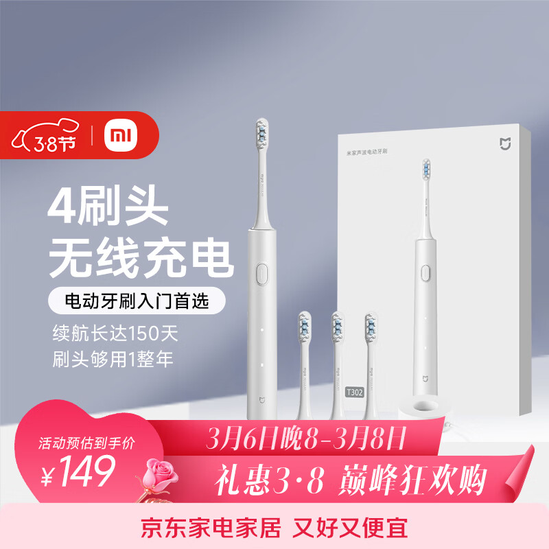 米家小米电动牙刷T302成人/学生150天续 4支刷头电动牙刷入门首选 生日礼物送男女友礼物