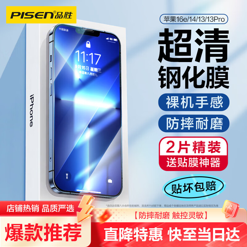品胜适用苹果16e/14/13/13Pro钢化膜iPhone16e/13/13Pro/14高清无边膜 防摔抗指纹全覆盖钢化膜 2片装