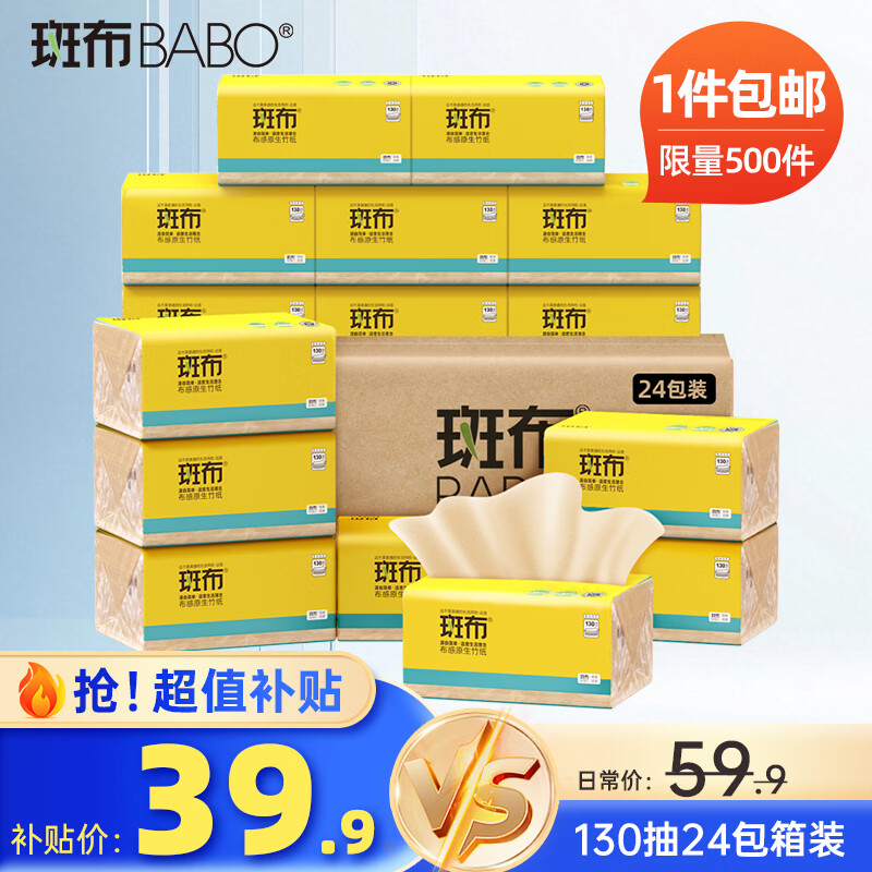 斑布抽纸餐巾纸 原生竹浆 遇水不易破 柔软亲肤 纸巾婴童适用 整箱装 3层 130抽*24包