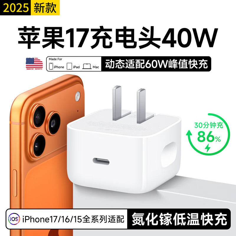 原装适配苹果17充电器原装40W快充iphone17ProMax/17Air/15/16手机正品插头TypeC充电头数据线套装 苹果17手机【40W快充头】动态调节功率 低温快充不伤机丨3C认证丨40W-60W动态适配