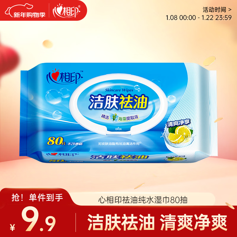 心相印洁肤祛油湿巾80片1包 擦脸洁面湿纸巾温和无酒精 新老包装随机发