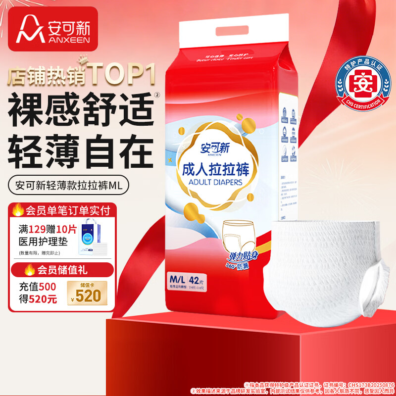 安可新成人拉拉裤M-L42片 臀围80-120cm 老人孕产妇轻薄内裤型纸尿裤
